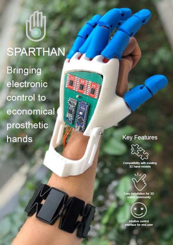 手部缺失的残疾儿童随着年龄的成长,需要经常更换手部假肢以适应身体的变化,然而此类假肢一般售价昂贵,维护困难。Sparthan团队利用自身的机器人开发优势,针对残疾儿童的需求,开发了一款开源的低成本模块化假肢产品。产品由臂环传感器、易操作的核心控制模块、3D打印的手部关节和外骨骼组成,伴随着残疾儿童的成长,他们只需定制和更换组件中成本相对最低的3D打印的手部关节,即可满足自己新的需求。同时这款产品也为假肢的研发人员提供了一个开源的、友好的、可用性更高的测试及实验材料。