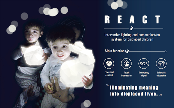 由于战争、气候变化、政治动乱等原因,全世界目前约有6850万人流离失所,其中超过51%的是18岁以下的儿童。从关心难民儿童的精神健康出发,REACT团队设计了一种难民儿童陪伴灯,作为难民儿童的日常玩具、应急设备以及与其他人互动的工具。