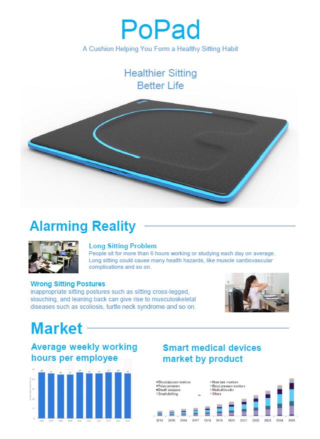 现今的大城市中,人们由于久坐或者不良坐姿受到了许多健康问题的困扰。Footprinter团队研发了一款可以监测用户坐姿并及时进行干预的智能坐垫。该智能坐垫通过内置的八个薄膜压力传感器来采集用户的坐时、坐姿等信息,在用户久坐或者长期处于不良坐姿时,其会通过内置的振动马达模块来进行相应的提醒与纠正。此外,该智能坐垫还配备有手机端的APP。用户可以通过APP实时获得自己的坐姿信息,并且对坐垫的相关参数、提醒频率等进行设置。