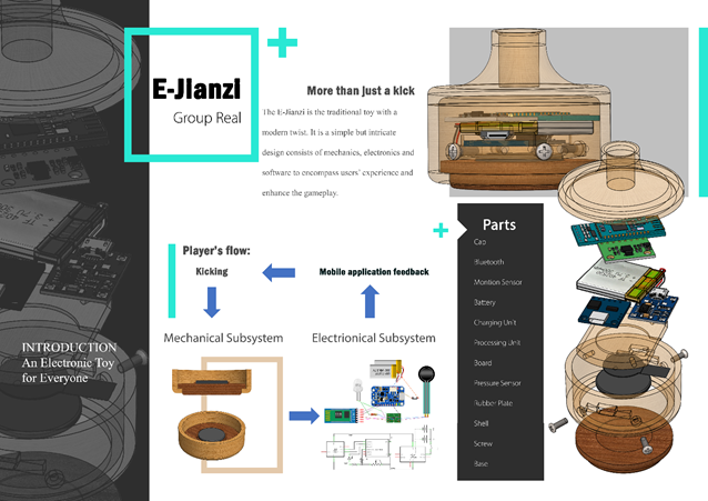 由于中国社会经济快速发展,代际间差异愈发显著,孩子与父母、爷爷奶奶之间的代沟成为了不可忽视的社会难题。为了解决这一问题,Real团队将传统游戏——毽子,通过近距离传输技术与手机等计算设备连接在一起,赋予老一辈的传统毽子更丰富、有趣的玩法,吸引年轻一代小朋友,从而通过游戏搭建孩子与父辈祖辈沟通的桥梁。另一方面,E-Jianzi(智能毽子)也能减少小朋友们的“屏幕时间”,让孩子们走出屋子,与家人一起锻炼玩耍。