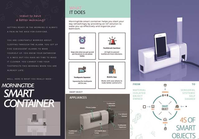 由Morningtide团队设计搭建的晨间效率提升站,是一款多功能IoT智能收纳盒,为有效唤醒上班族与员工党,协助收纳整理浴室提供了物联网解决方案,助力奋斗者以清新的早晨高效地开始新的一天。晨间效率提升站由手机APP智控,集感应闹钟与自动牙膏、洗漱用具与手机收纳、红外感应与紫外消毒于一身,满足青年奋斗者健康、高效、智控的需求。团队完成了一件商业前景广阔的敏捷产品设计与制造,也在过程中提升了综合管理、商业、设计、制造的综合实践能力。