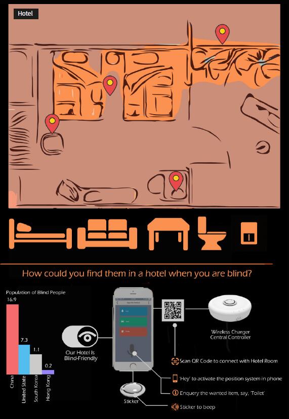 全球范围内绝大多数视障人士的主要活动场所都是在室内,几乎所有的视障人士都存在找东西和定位的困难,这导致他们在家中的独立生活困难重重,独自旅游出行更是难上加难。Edge团队利用WiFi和蓝牙技术,开发了一款智能定位贴片,并将现有的智能家居设备与我们的产品结合,最终实现对室内常见物品如水杯、药瓶,以及房间设施如冰箱、衣柜等的定位。同时实现利用手机直接操控室内家电的功能,帮助视障人士能够在家中更好地独立生活。同时,此款产品也可以成为无障碍酒店的标配,使视障人士在陌生环境居住时也能尽快找到需要的设施。