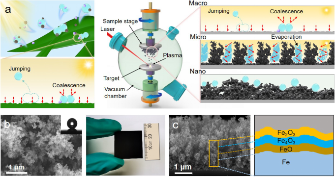 受小麦叶片上水滴弹跳和光热转化策略的启发,研究团队使用超快脉冲激光沉积(PLD)技术,制造出具有微纳米多层结构表面(CR-SAS)。在冷凝水高效自清除和高效太阳能吸收的协同作用下,CR-SAS表现出优异的抗反射和光热转换性能。这得益于微/纳米多层结构中的光俘获效应和氧化铁纳米粒子的热等离子体效应。同时,CR-SAS对冷凝水展现出超疏水性,其超疏水性能优于荷叶表面,不仅对宏观毫米级水滴超疏水,而且对冷凝微尺度水滴也超疏水。在表面能的作用下,冷凝水在冻结之前从表面合并弹跳,从而暴露出更多的裸露面积发生光热作用。在太阳光照射下,即使在-50°C的超低温和极高湿度(冰过饱和度约为260)的环境下,CR-SAS表面温度也大于0°C。更重要的是,CR-SAS可以在不同材料上沉积,且具有优异的可靠性,为在实际防冰应用提供了巨大潜力。