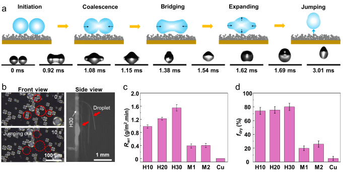 图2.CR-SAS表面冷凝水滴弹跳。(a)冷凝水弹跳过程;(b)冷凝水通过聚合和弹跳连续地从CR-SAS移走;(c)水滴弹跳移除速率统计;(d)平衡后水滴弹跳之后表面裸露面积统计
