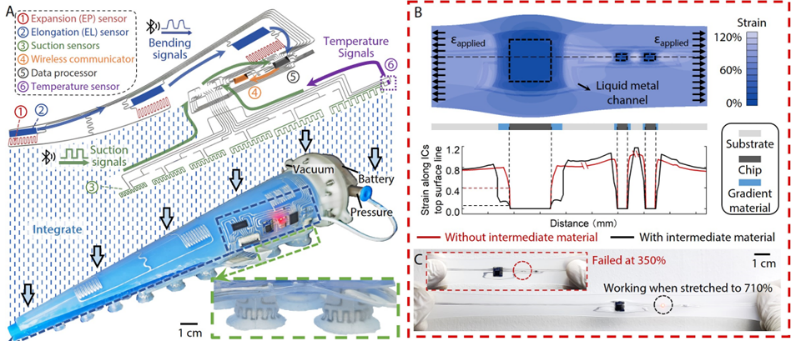 生物章鱼臂的形变程度可以达到200%—300%,不仅可以拉伸,还可以自如地收缩、弯曲、膨胀。传统刚性电路板制成的机器人难以实现这些力学性能,因此,研究团队采用液态金属柔性电路,为大变形软体机器人集成具有多种传感(例如弯曲、吸力、温度)及自主信号处理能力的大拉伸电子系统。在此期间,团队还解决了柔性基底与硬质芯片在大拉伸状态下易产生剥离的问题,通过嵌入中间硬度的缓冲材料,有效地降低了芯片连接面处的应变,提高了柔性电路的拉伸率。经过增强后,简单柔性电路单元在拉伸至710%的状态下仍能正常工作,对于集成传感以及电子元件的复杂电路,其拉伸性也从140%提升到了360%。