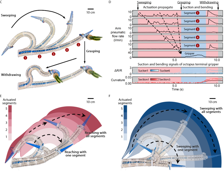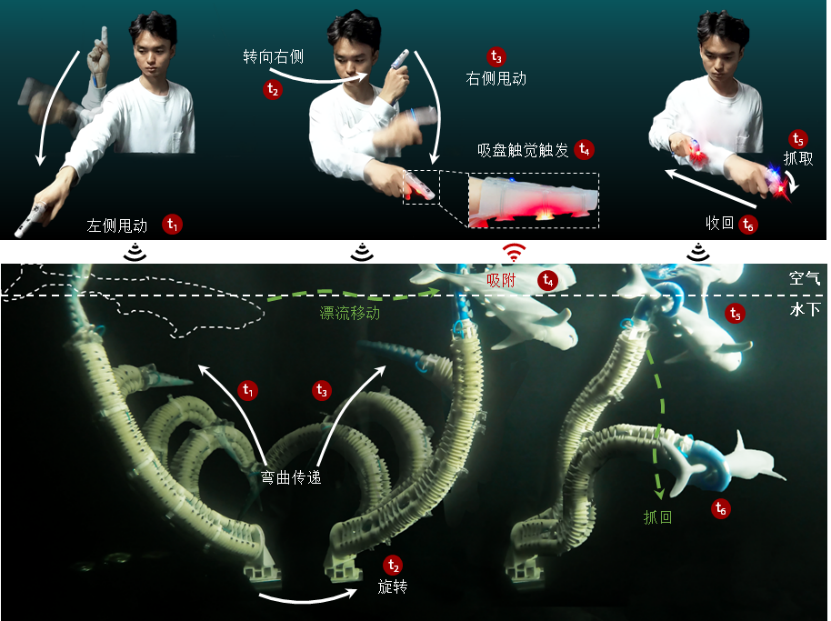 根据生物章鱼的观测数据,课题组发现,章鱼触手的抓捕动作采取“弯曲波传递”的方式,“很像我们挥舞长鞭,指令从鞭子根部像波一样传导到末端”,然后通过高度敏感的触手/吸盘神经网络触发停止和抓取信号,对物体进行抓取并拉回。