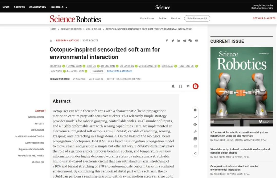 这项研究涵盖了多个研究领域,涉及生物学和机器人学等多方面的交叉。谢哲新、袁菲阳、刘嘉琦、田路峰为论文的共同第一作者,北航丁希仑教授、清华大学张一慧教授、新加坡国立大学Cecilia Laschi教授为论文的合作作者。文力为论文的通讯作者。北航为研究论文的第一/通讯单位。本项目得到了国家自然科学基金项目、创新研究群体等项目的支持。