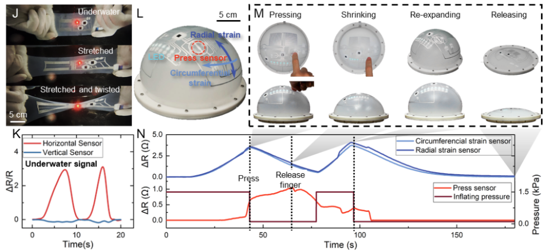 这种增强的柔性电路不仅能够在单一轴上承受大幅拉伸应变,而且还具备对多轴拉伸应变的适应能力。更为引人注目的是,这种柔性电路不仅仅被动地适应变形,而且能够通过感知人的交互进行主动响应和相应的变形。这种智能化的柔性电路为软体机器人的实时环境感知和主动决策创造了强有力的基础。