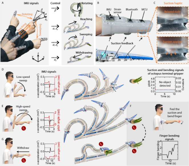第三个难关是将仿生机械臂的感知信息准确反馈到人身上,进一步实现自然、直观的人机交互。章鱼即使视力很差,依旧能凭借出色的感知力成为高超的捕食者,研究团队从中汲取灵感,制作了基于大拉伸电子电路的可穿戴柔性触觉装置,用于感知和控制仿生章鱼臂。柔性吸附触觉指套的设计与制作主要由博士生田路峰负责,指套内侧嵌有吸盘结构,当抓持器吸盘吸附上物体时,信号传递到指套,指套内嵌吸盘会产生负压,在手指上同步产生吸附触觉,将机器人触觉传递到人手。柔性指套的引入不仅为用户提供了更直观、自然的控制手段,而且通过无线通信与仿生章鱼触手抓持器实现了高效的协同作业。