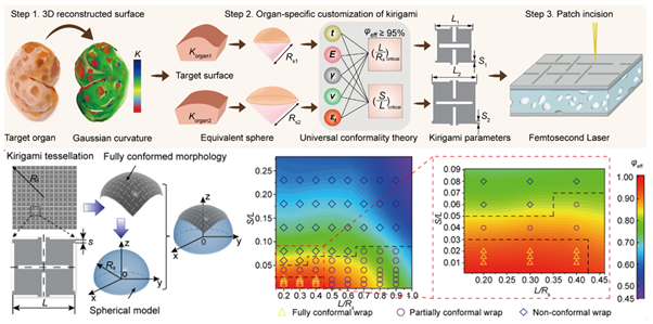 面对这一核心需求,徐晔教授团队基于旋转刚性负泊松比结构单元构建的剪纸超材料,创造性提出“器官定制化剪纸共形设计理论”。该理论首次以“有效面积覆盖率”为核心优化指标,建立起器件剪纸结构单元几何参数、材料力学属性与器官曲率之间的定量构效关系。通过对任意器官进行三维扫描建模,该共形理论可给出最优剪纸结构参数,实现剪纸结构与功能之间的最佳平衡。基于该理论,研究团队针对卵巢、肾脏等多种靶器官,定制化设计了相应的剪纸结构贴片,使其在器官复杂曲面上实现自适应贴合与功能最大化。研究结果表明,定制化设计的剪纸贴片在不同器官表面的有效共形覆盖率均超过95%,有效突破了传统柔性贴片“共形性与功能区保留不可兼得”的设计难题。