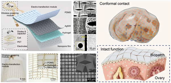 在肿瘤及其他重大疾病的治疗中,实现对病变器官表面的局部精准干预,是提升疗效、降低毒副作用的关键。以卵巢疾病治疗为例,携带BRCA1等遗传突变的卵巢癌高危女性患者,为降低癌变风险,目前临床普遍建议手术切除器官,但这将导致患者永久丧失生育功能。传统全身性给药或基因递送方法(如口服、注射)常因路径长、靶向性差,往往疗效有限,甚至可能误伤周围正常细胞。即便如纳米电穿孔等局部物理递送技术,也因器件与组织表面共形贴合能力不足,难以在复杂器官表面实现安全、高效的全覆盖精准干预,更无法有效规避对正常细胞的干扰,存在效率低、风险高的瓶颈。因此,开发兼具高度共形贴合与精准递送功能的生物电子器件,成为临床治疗的迫切需求。