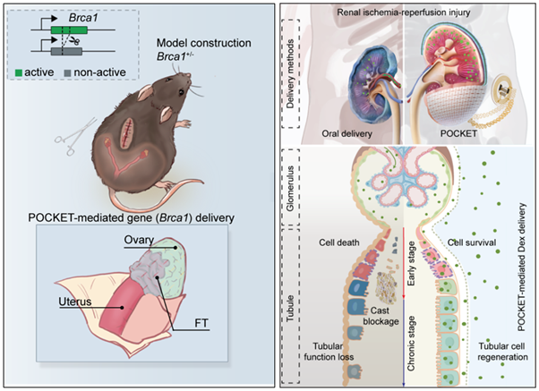 图3 POCKET器件实现卵巢的精准基因治疗及时间可控的肾脏长期给药