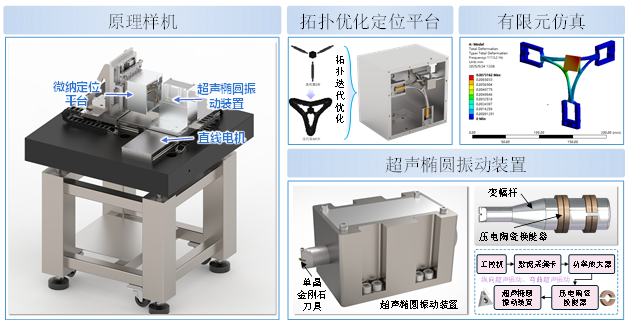 为实现硬脆材料微纳结构表面的高质量创成,研制了大行程高带宽超精密加工设备,建立了微纳定位平台的拓扑优化算法,设计了超声椭圆振动辅助装置,开展了原理样机的理论建模分析与多物理场有限元性能仿真,并集成开发了操控交互软件,如图1所示。