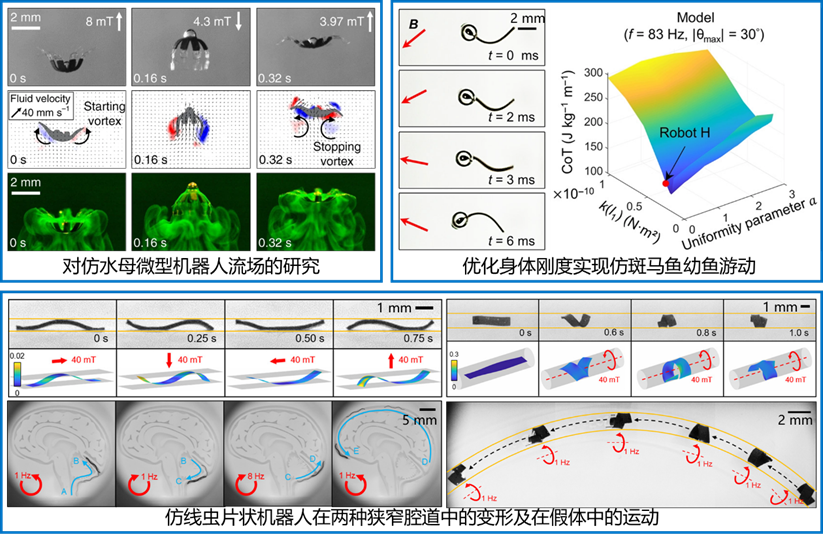 针对面向医疗应用的微型软体磁驱机器人在体内复杂流体环境(如静态液体腔体、动态流速水域及狭窄充液管腔等)中运动能力受限的问题,汲取自然界微小生物的运动机理指导仿生设计,建立了中雷诺数下的流固耦合模型与机器人动力学理论,揭示了仿水母游动中的涡旋辅助非接触操控机制、仿斑马鱼高频游动中的刚度-效率匹配规律,以及仿线虫在受限空间内利用被动形变与环境交互的推进机理,实现了具备多模态运动、选择性物质输运及复杂狭腔适应能力的一系列微型仿生软体机器人。