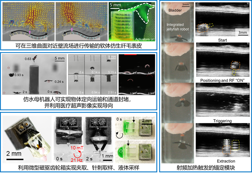 针对微型软体机器人因受限于加工工艺、载荷体积及供能控制而难以集成复杂医疗功能的问题,提出了基于软体本体运动调控流场的功能增强策略与高功率密度微型模块集成方案,建立了利用电控仿生纤毛阵列对近壁流场进行多维灵活操控的方法,实现了基于改进型仿水母机器人的药物输运、腔道封堵及超声引导下定点贴附;研制了高减速比微型磁驱齿轮箱,突破了小尺度下磁驱动力不足的限制,实现了针刺活检与液体采集;提出了基于射频电场加热的远程触发机制,开发了按需锚定与靶向给药模块,解决了磁驱运动与功能触发信号间的耦合干扰难题。
