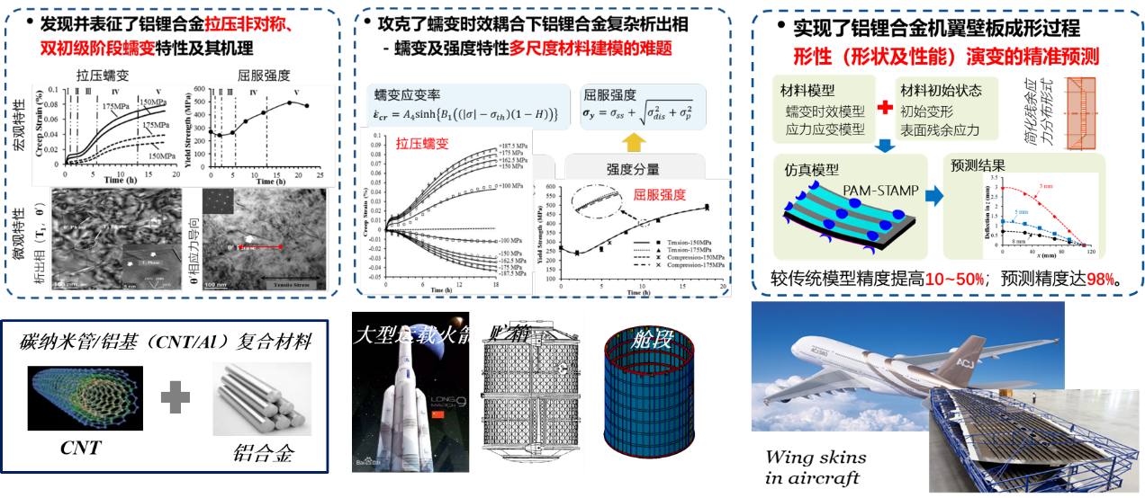 针对金属材料(铝、钛合金等)及金属基复合材料复杂薄壁构件热力耦合成形制造过程中微观组织与宏观变形/性能演变复杂、高效调控方法缺乏等问题,建立了基于物理机制的微-宏观跨尺度材料本构建模方法、基于晶体塑性有限元的微-宏观结构工艺仿真方法,实现了多类铝、钛合金及其复合材料热成形及焊接等制造全过程形性协同预测,为运载火箭、大型客机、直升机的大型壁板、框梁、封严环等关重构件制造工艺设计及研制应用提供关键技术支撑。