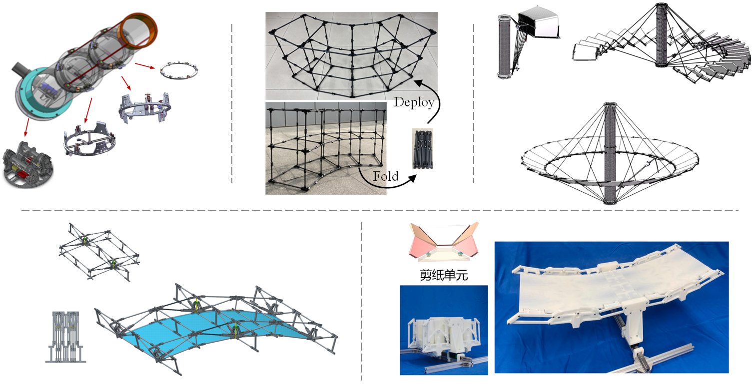 面向特定航天功能形面要求,基于典型机构单元通过特定的组合方式和运动形式扩展创新设计了一系列能够紧凑收拢、具有特定功能形面的折展机构:基于同构单元周向/轴向组合的套接式折展机构、可准确拟合给定准线方程的柱面折展机构、具有连续光滑表面的圆环面、抛物柱面折展机构等。